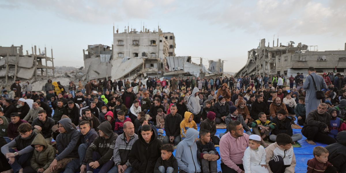 Palestinští muslimové se 20. března 2026 shromažďují k modlitbám Íd al-Fitr uprostřed trosek zničených budov v Džabáliji v pásmu Gazy. Foto: AP/PTI.