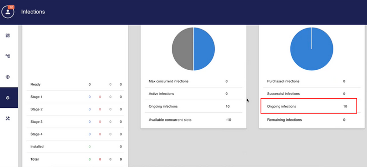 Snímek obrazovky řídicího panelu Predatoru se seznamem probíhajících infekcí