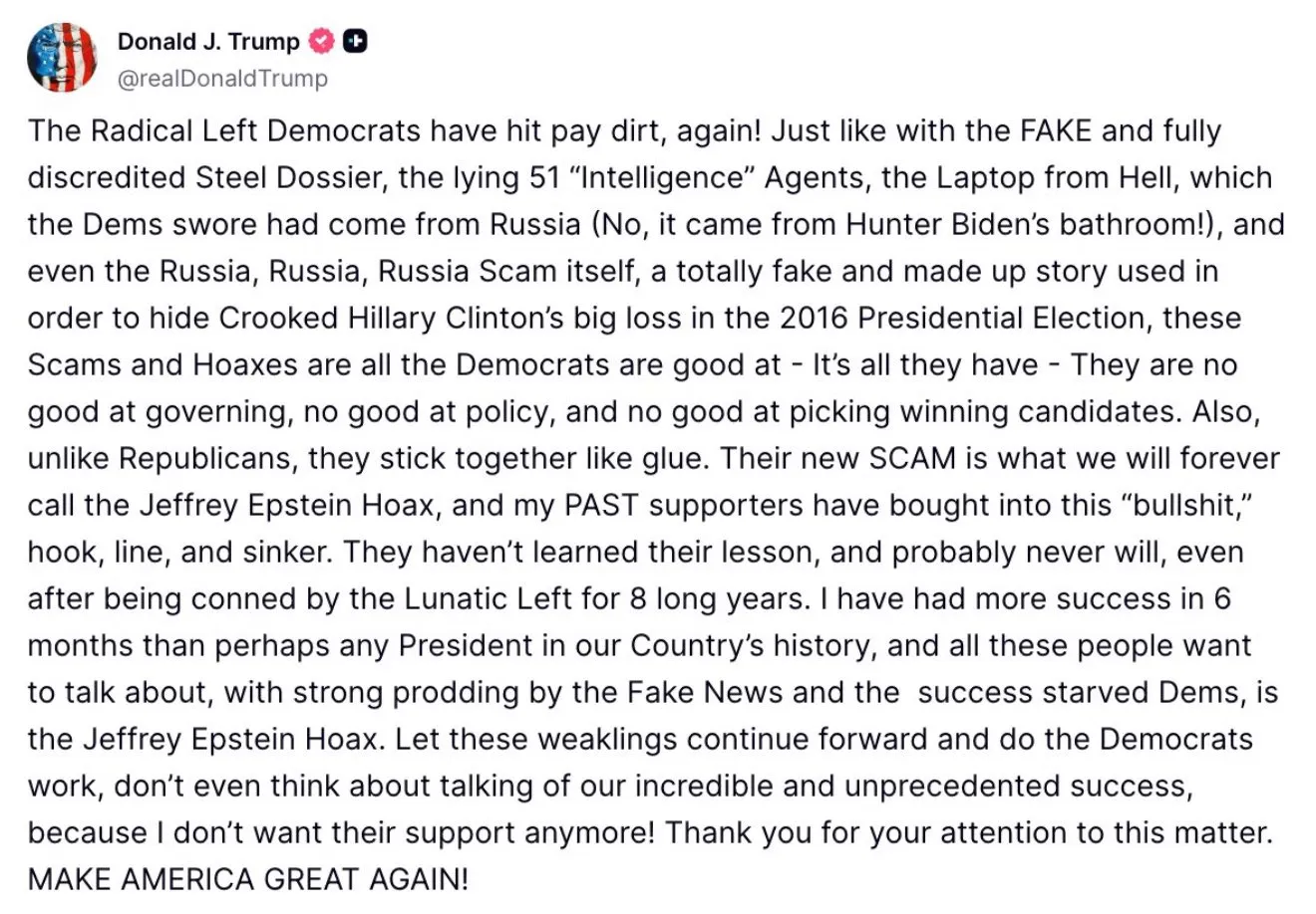 Úvahu Something has changed in Trump: Dark comments about Epstein ‚hoax‘ lead supporters to drop off MAGA bandwagon and Trump says ‚I don’t want their support anymore!‘ publikoval Leo Hohman na svém Substacku 16. července 2025