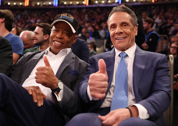 Dosavadní demokratický starosta 8,5milionového města s rozpočtem jako Česká republika Eric Adams (vlevo) letos už znovu nekandidoval. Nepopulární expolicista s řadou skandálů se v poslední fázi kampaně připojil k Mamdaniho nejsilnějšímu soupeři Andrewu Cuomovi. Foto Al Bello, AFP