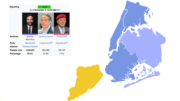 Kolem Mamdaniho kampaně vznik tento rok rekordní stotisícový sbor dobrovolníků. Zmobilizovat se podařilo komunity napříč celým městem, včetně například potomků indo-karibských či bangladéšský migrantů, dosud politicky úplně neangažovaných. Mamdani zvítězil ve všech historických čtvrtích města s výjimkou Staten Islandu. V rámci čtvrtí pak hlasovaly pro Cuoma výrazně už jen okrsky na jihu Brooklynu, na severu Queensu a v okolí Central Parku.