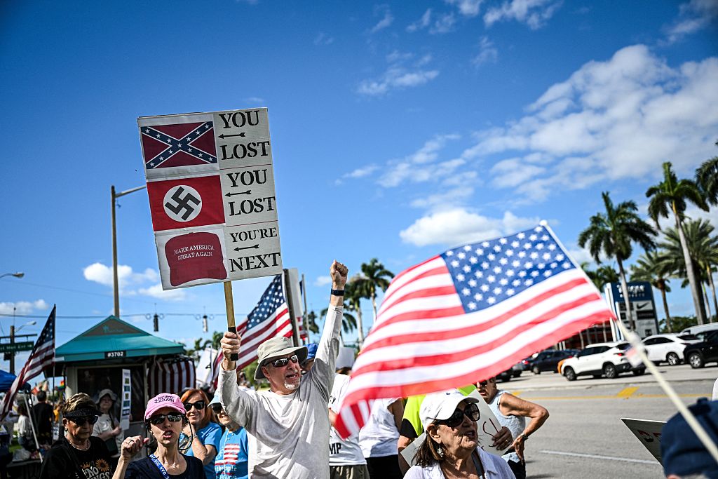 Lidé se účastní celostátního protestu „Žádní králové“ ve West Palm Beach na Floridě 18. října 2025.