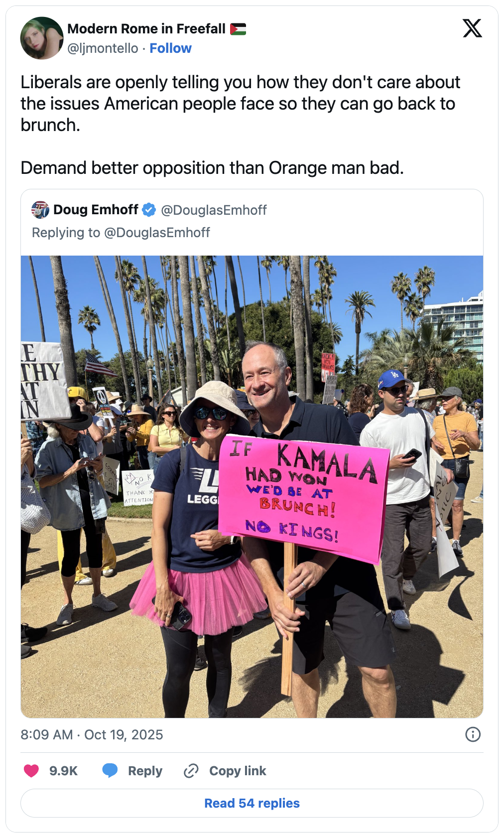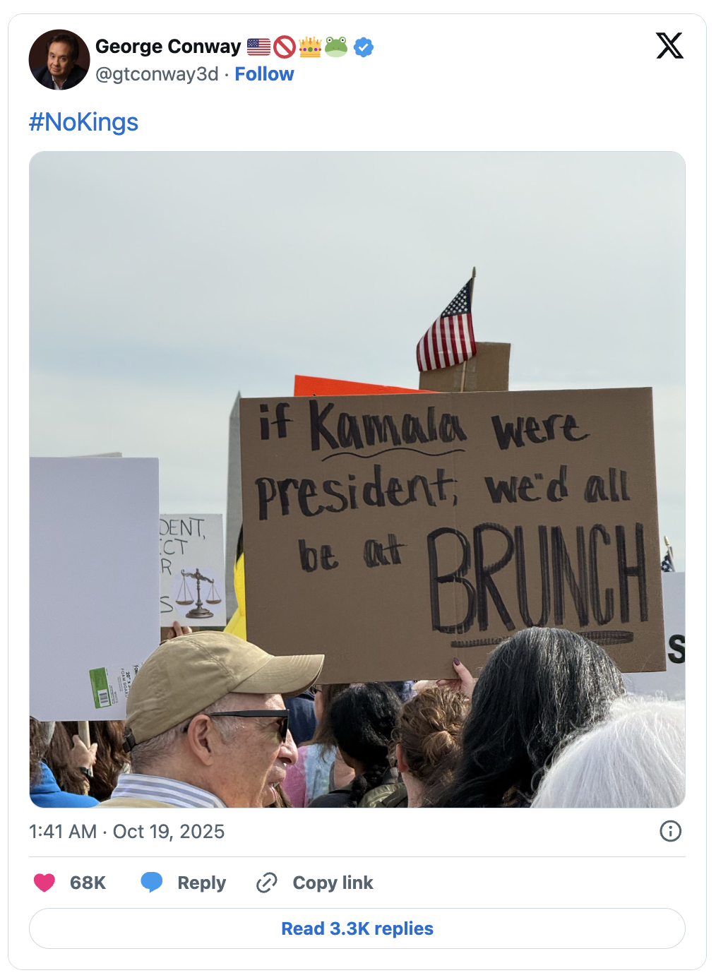 Miliony lidí zaplavily o víkendu americké uliceČesky protesty „Žádní králové“, aby se postavili proti monarchii, která neexistuje, bez jediného hmatatelného požadavku. Moc nebyla nijak smysluplně zpochybněna. Status quo nebyl ani v nejmenším narušen. Lidé drželi transparenty s nápisy, že prezident je oranžový a že kdyby byla prezidentkou Kamala, byli by na brunchi, a pak šli domů.