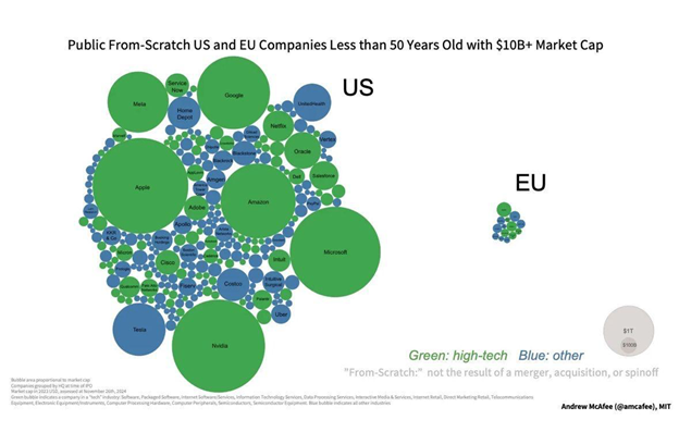 Tuto prohlubující se ekonomickou propast nelze vysvětlit demografickými údaji . Vyjadřuje spíše silnější růst produktivity v USA, který je z velké části tažen technologickými inovacemi a vyšší celkovou produktivitou faktorů. Dnes je zhruba polovina z 50 největších technologických firem na světě amerických, zatímco pouze čtyři jsou evropské. Během posledních pěti desetiletí se 241 amerických firem rozrostlo ze startupů na společnosti s tržní kapitalizací nejméně 10 miliard dolarů, oproti pouhým 14 v Evropě.
